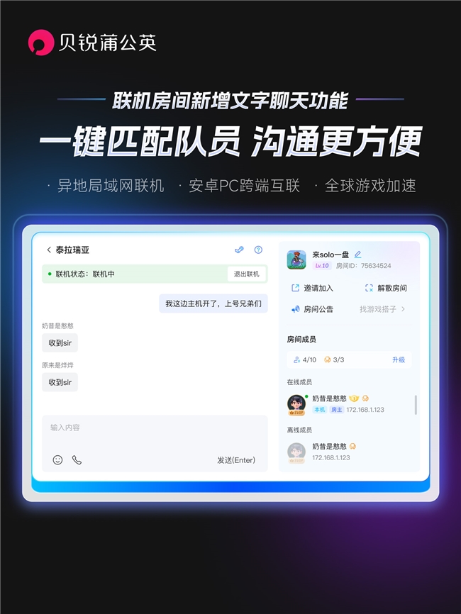 每一个组网房间不再只是一个网络连接通道,也成为了一个即时互动的聊天室,为合作类游戏提供了更加顺畅的协同体验。